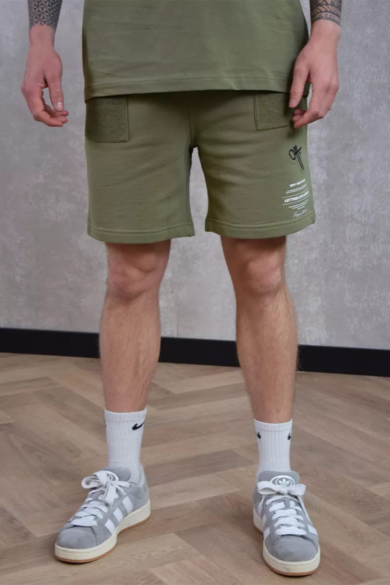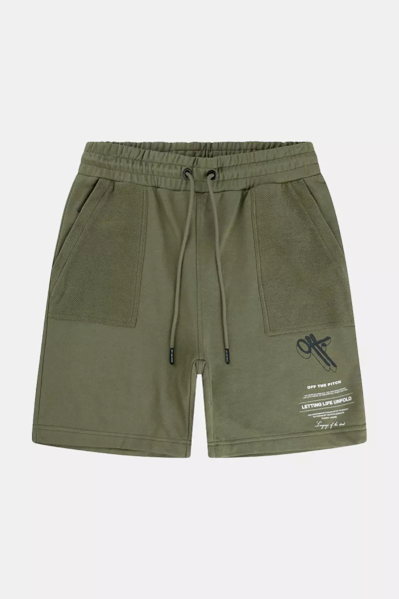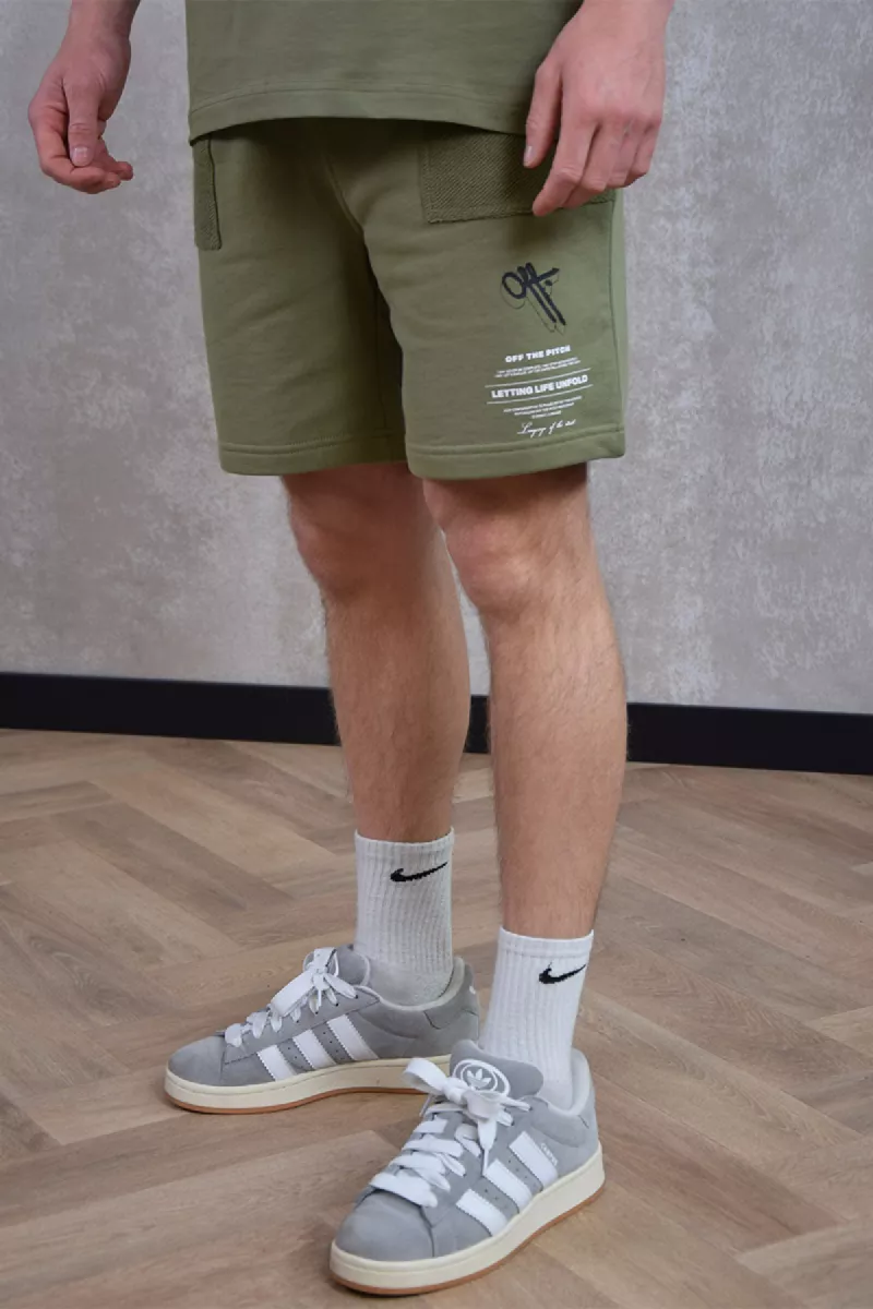 De sweatshorts van Off The Pitch hebben een comfortabele pasvorm en vallen op knielengte. De short heeft twee steekzakken met een ritssluiting aan de zijkant. Op de linkerkant is een logo van Off The Pitch gedrukt.